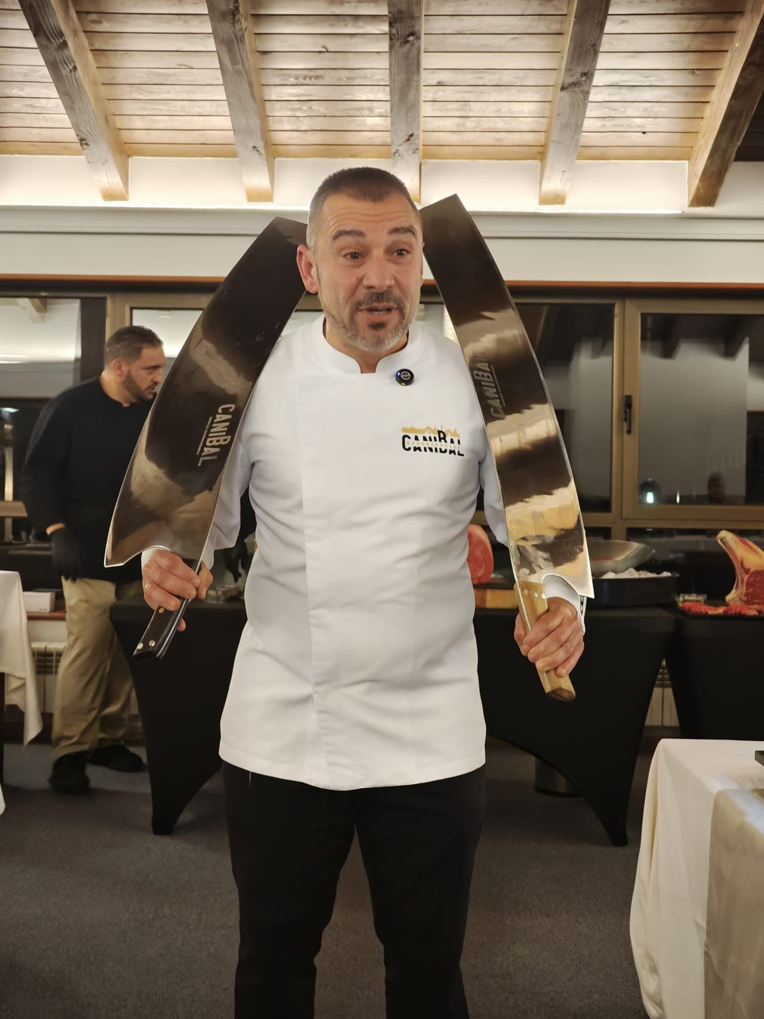 El chef Juan Antonio Caníbal durante el espectacular manejo de los grandes cuchillos, uno de los momentos más teatrales y aplaudidos de la noche.